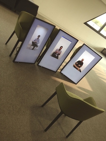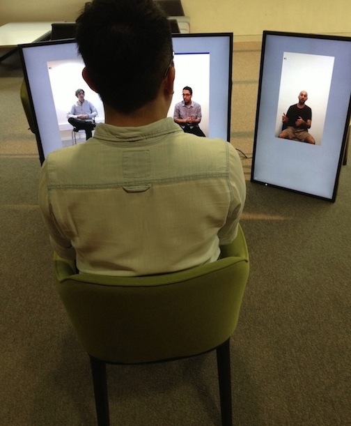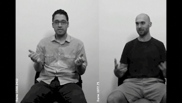 'Gesture / Language / Mirror' is an interdisciplinary computational art project funded by City University of Hong Kong, led by Dr. David Gruber and Dr. Daniel Howe. The project takes 'mirror neuron' (MN) findings from the neurosciences as inspiration for a new algorithm that matches gestures across videos of actors performing group therapy transcripts. The algorithm detects changes in hand and body position, causing the videos to ‘jump’ to the closest matching gesture. Videos run simultaneously while one screen/video acts as the 'driver' and the others search for gesture matches. This creates a fragmented narrative driven by gesture and posture instead of chronology.